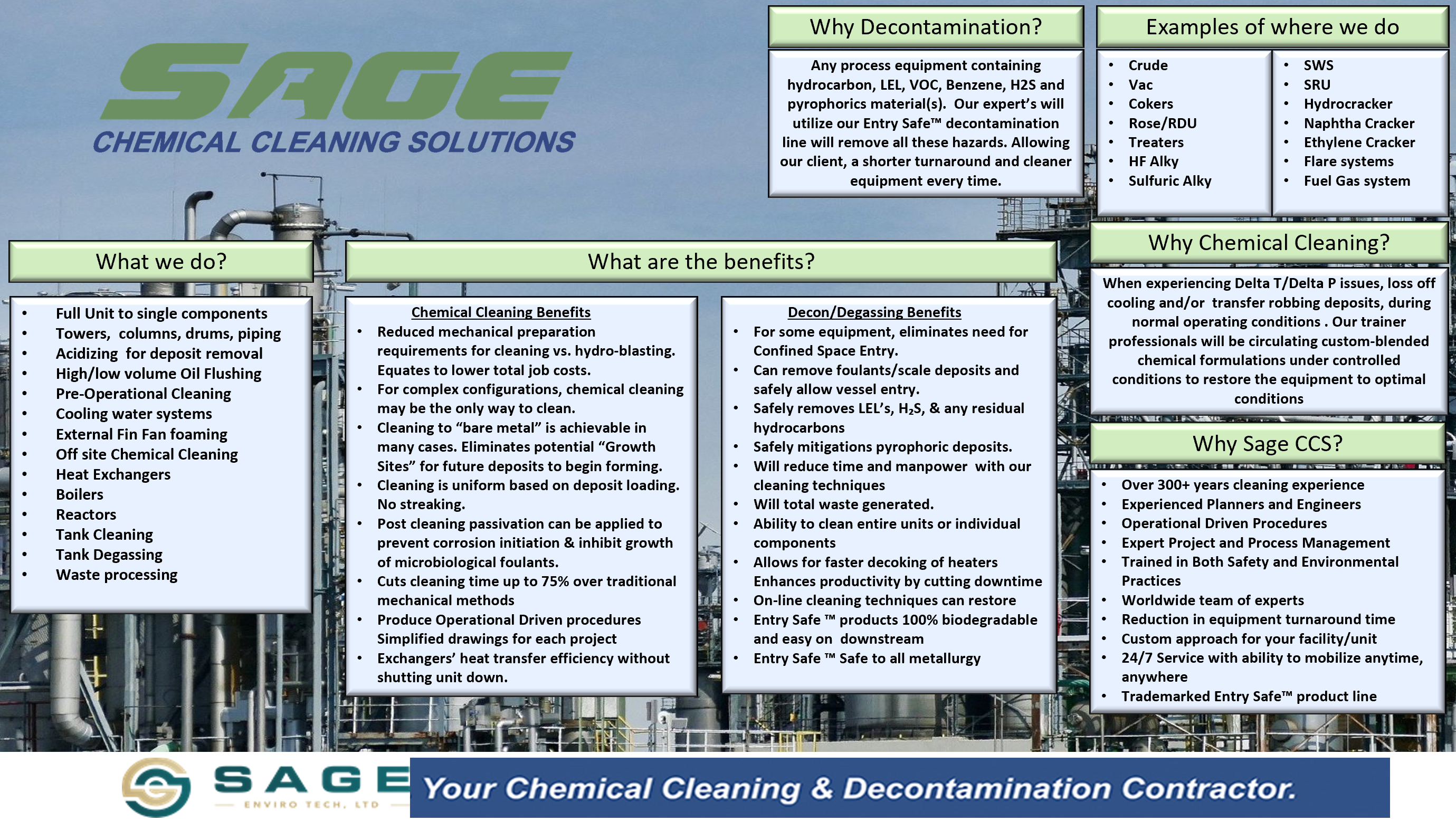 - Sage Chemical Cleaning and Decontamination’s team uses an analytical laboratory capable of: measuring deposit density, identifying deposits, testing solvents & recommending procedures, and performing post-cleaning analysis of drain samples.